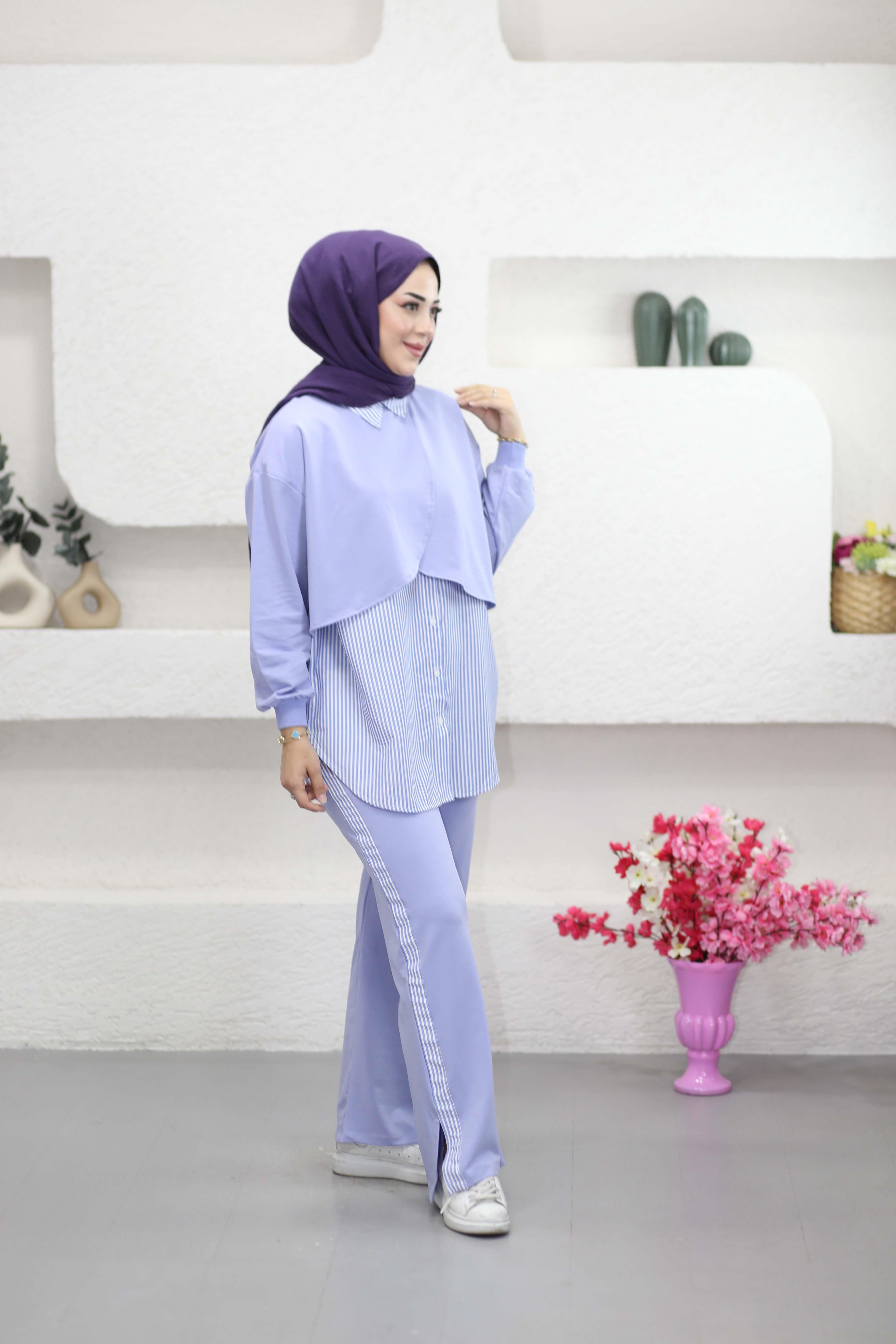 Çizgi Garnili Pelerin Görünümlü Takım Lila 3064 (25YTKMEKTX.019)