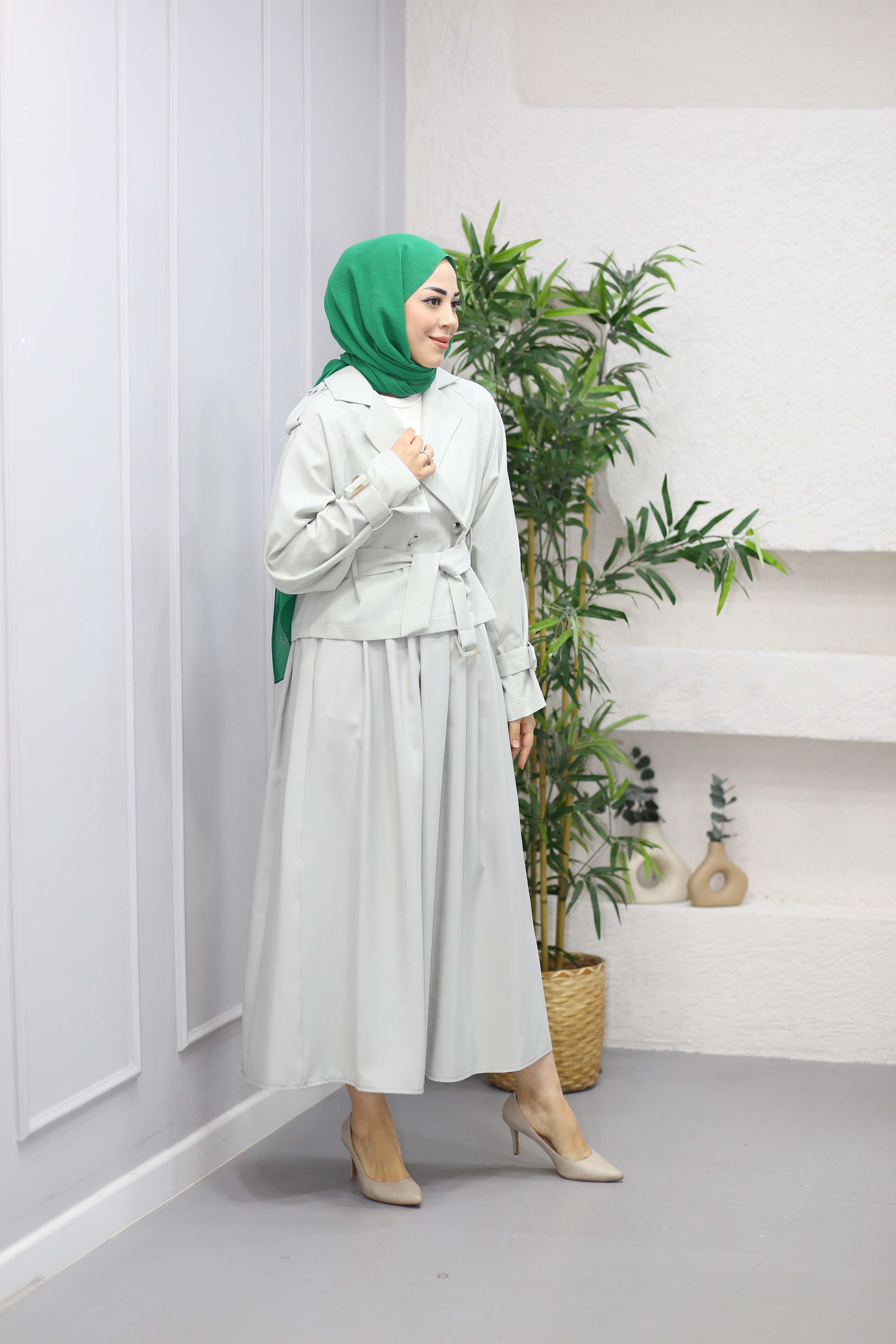 Çizgili Kemerli Etek Takım Açık Gri 2964 (25KTKMLIN.0011)