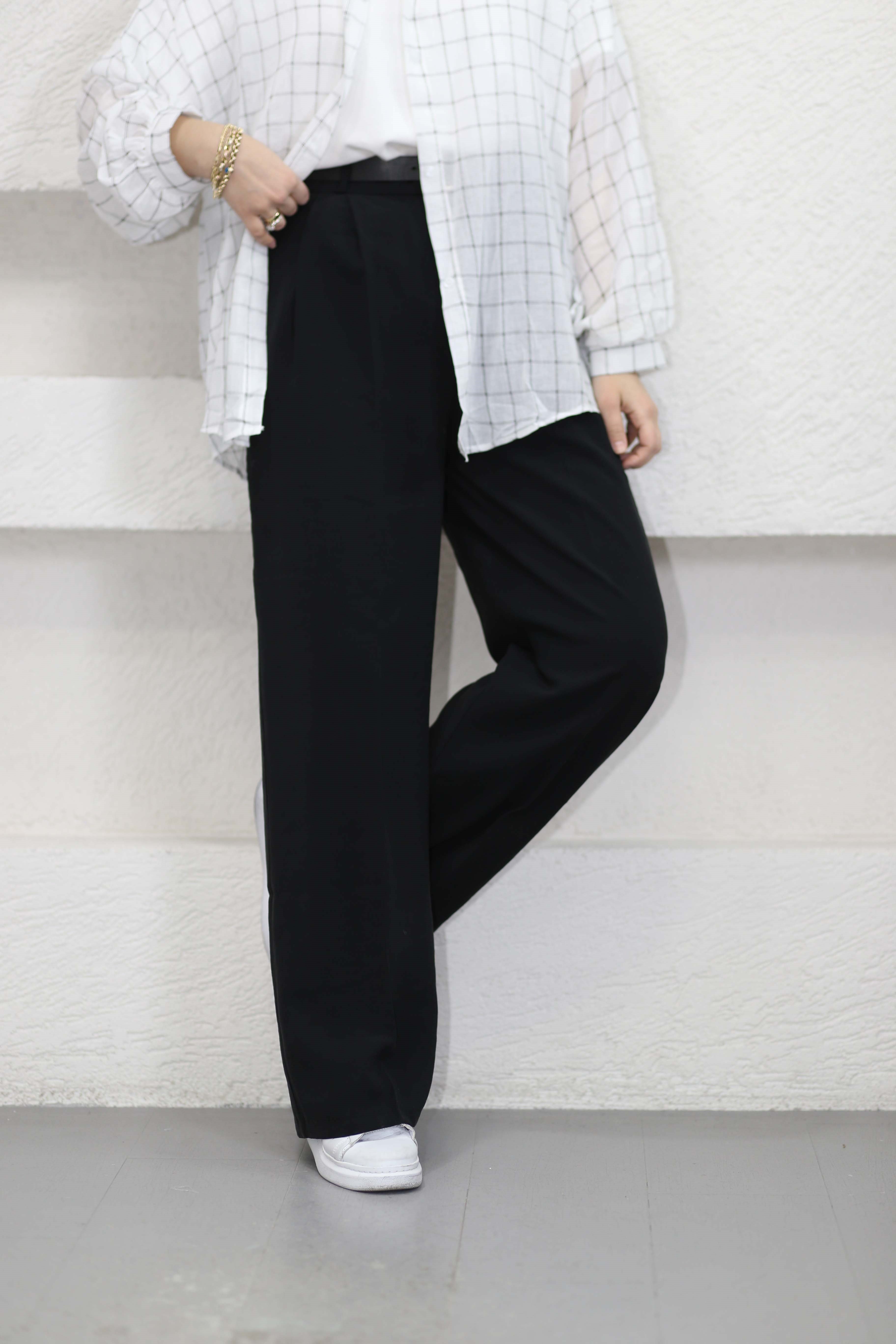 Deri kemerli palazzo pantolon Siyah 4913