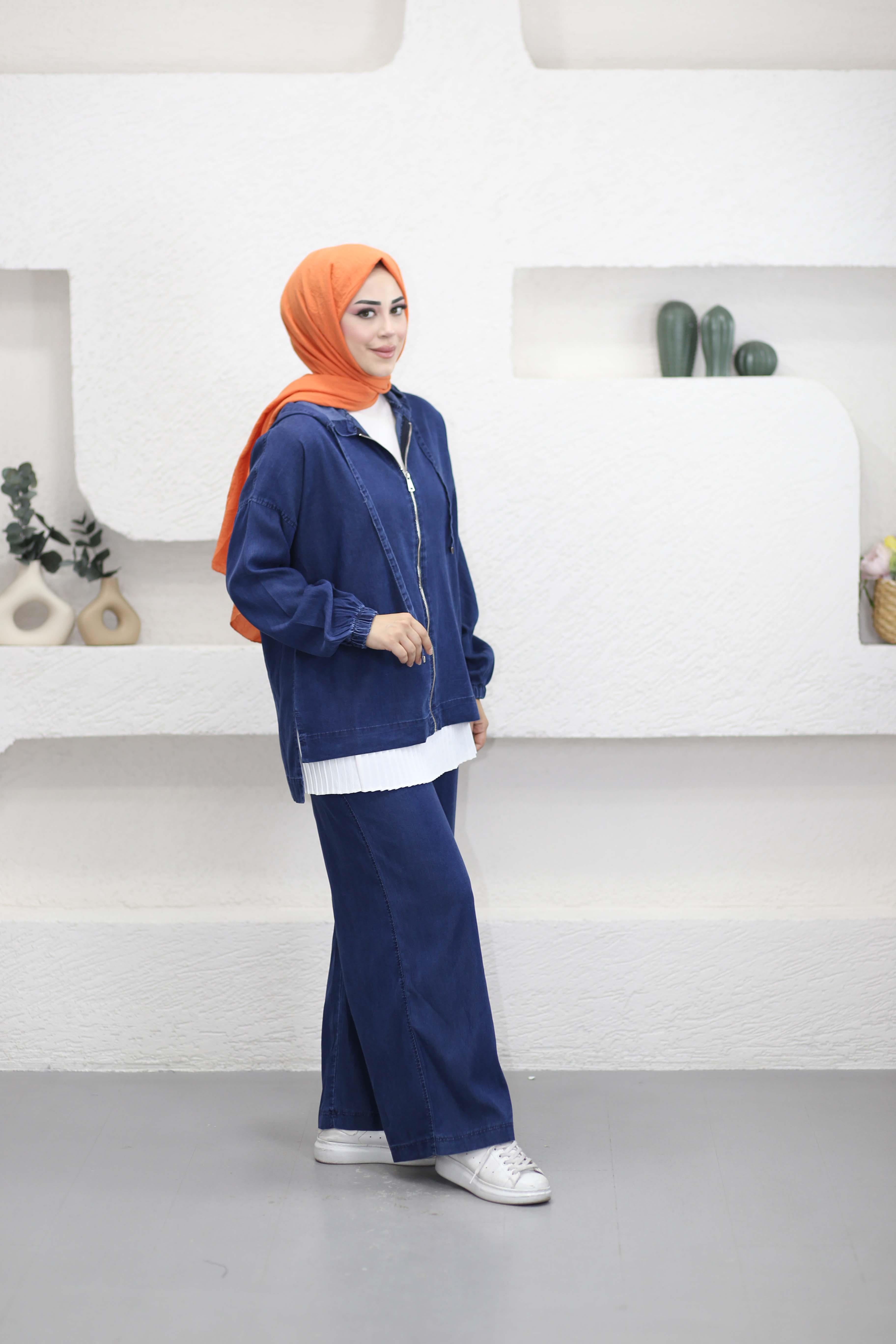 Fermuar Yaka Denim Takım Koyu Mavi 5869
