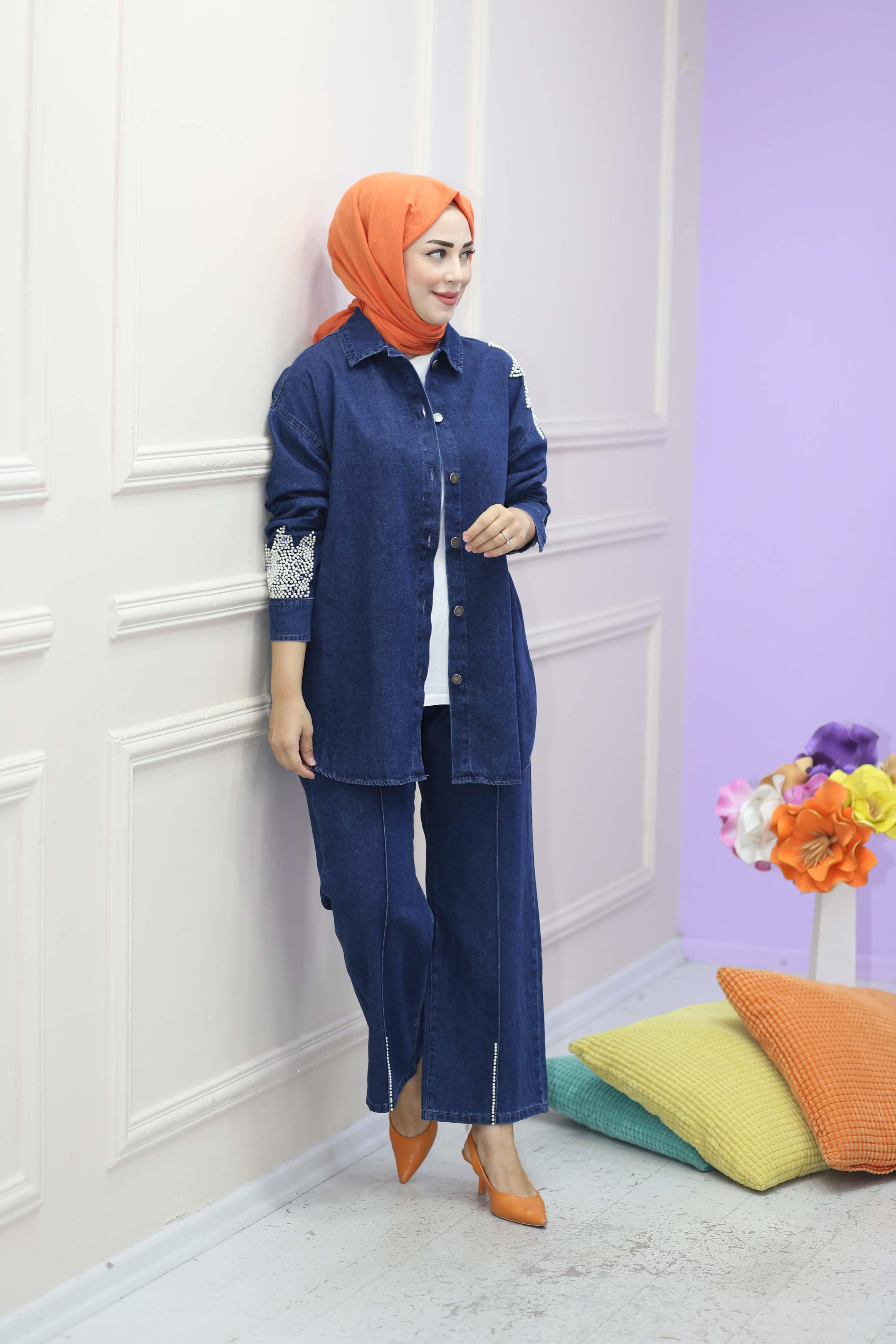 Omzu İncili Yıldı Denim Takım Koyu Mavi 7200