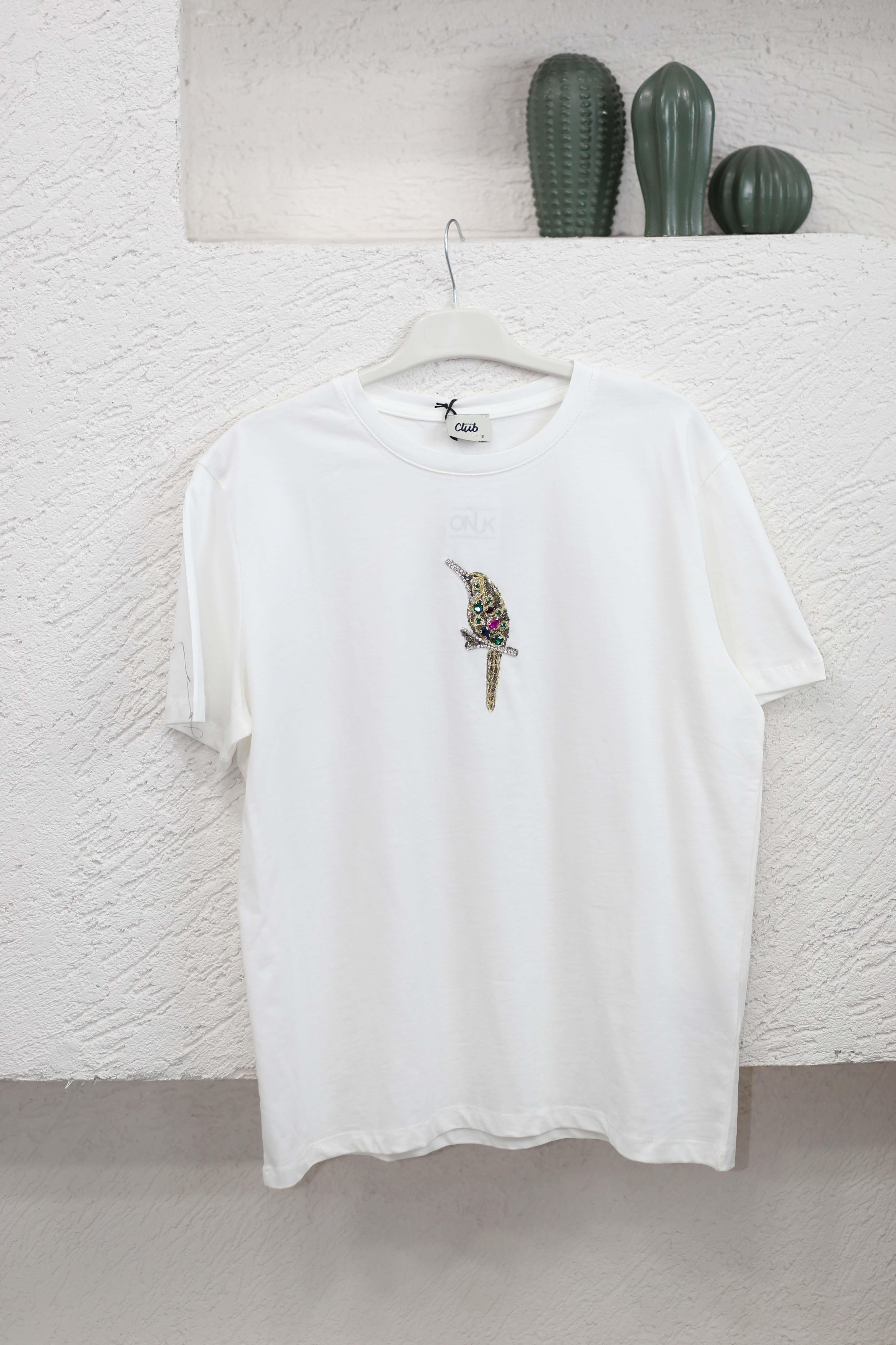 Papağan Taşlı Tişört Beyaz 9008 (25YUGYESE.0006)